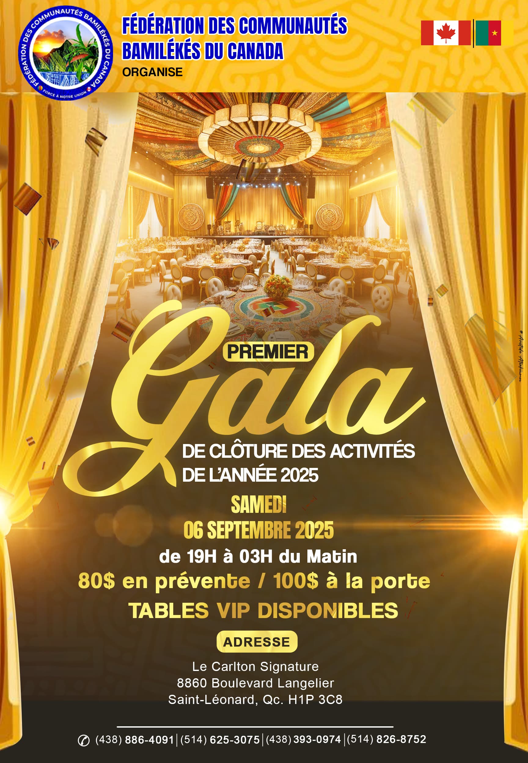 C'est avec un immense plaisir que la Fédération des Communautés Bamilékés du Canada vous convie à son Grand Gala de clôture des activités de l'année 2025.